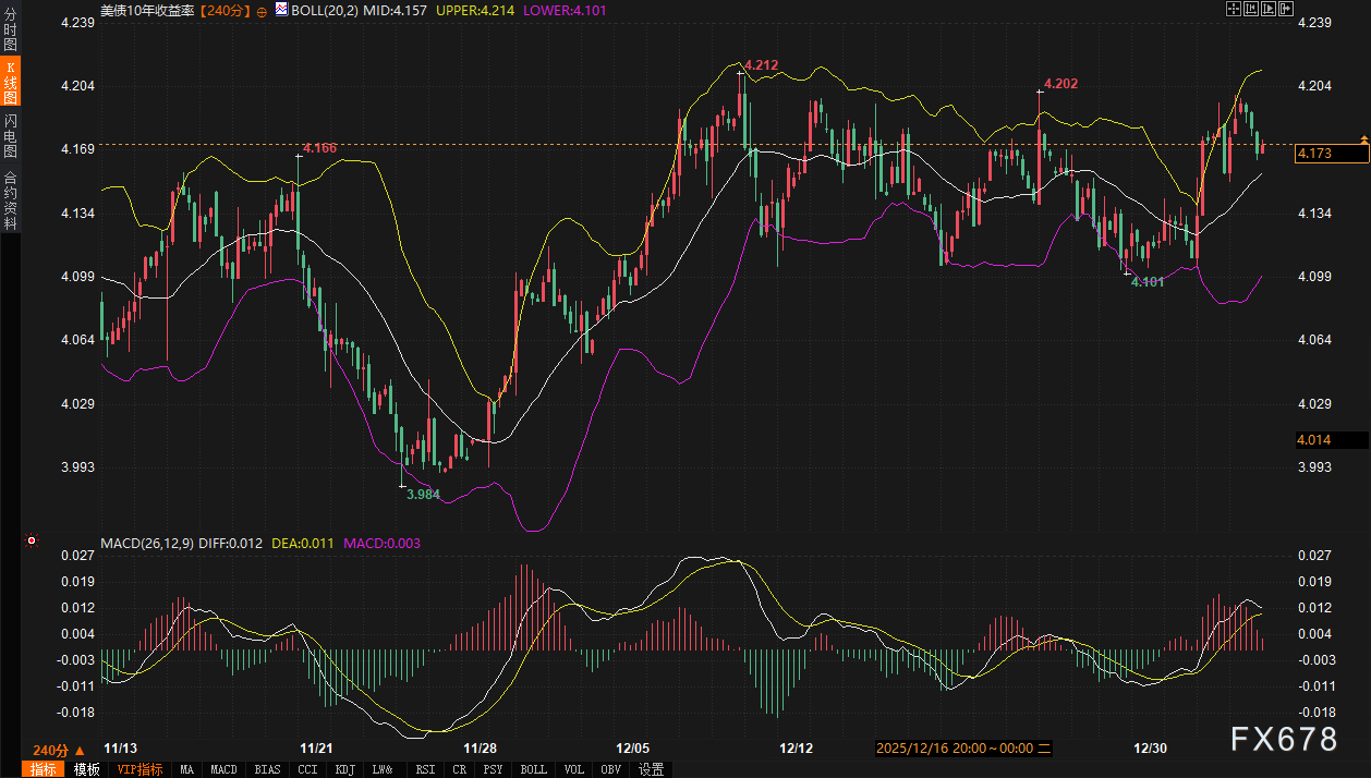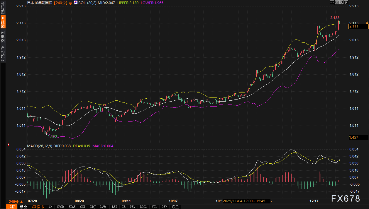 利率市场方面,美债与日债走势背离。10年期美债收益率日内下跌0.55%,报4.173%,技术上仍维持在布林带(20,2)中轨4.157上方,MACD指标显示上涨动能略有减弱。与之形成鲜明对比的是,10年期日债收益率大涨1.88%至2.111%,其布林带上轨已升至2.130,MACD保持上行态势,显示强劲的上涨动能。日债曲线的“熊市扁平化”变动(即长短端收益率均上升,但短端升幅更大)值得关注,这反映了市场对日本央行未来政策调整的押注。欧元区基准的10年期德债收益率下跌1.5个基点至2.90%。