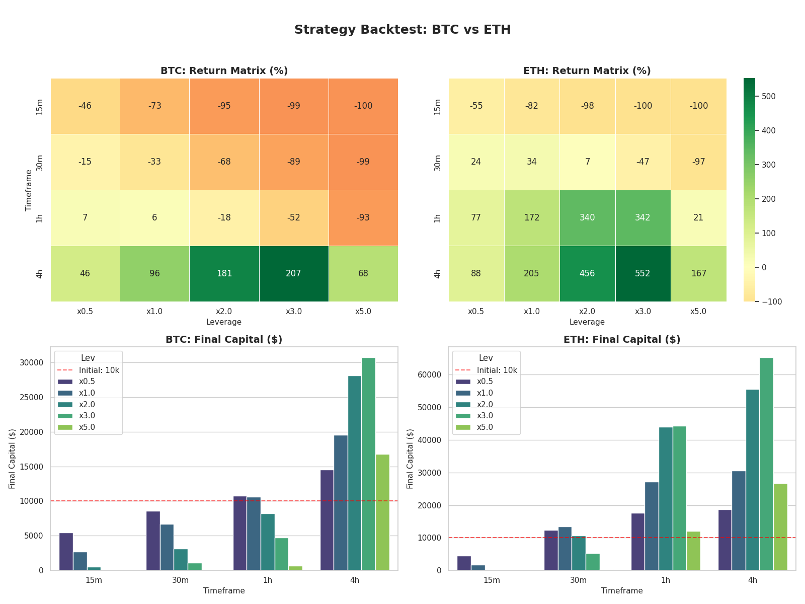 - 左下 & 右下 (柱状图 - 最终资金):红色虚线 (10k): 这是盈亏平衡线。柱子低于红线代表亏损,高于红线代表盈利。BTC vs ETH: 注意右下角 ETH 的 4h 柱子。当你使用 x2.0 或 x3.0 杠杆时,资金柱极其高耸,远超 BTC 的表现,这验证了在趋势行情中 ETH 的波动性带来了更高的超额收益。