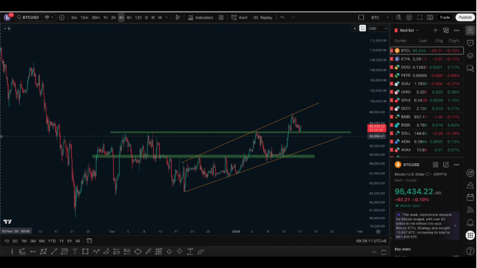 目前盘面最核心的观察点,依旧是下方94,000这一关键支撑。