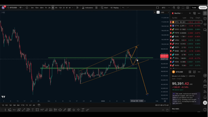 如果走势相对理想,价格可能在94,000附近获得支撑,回踩不破,随后展开一段反弹上行,完成多头最后一段冲刺。在这种情况下,回踩支撑后,仍可能存在一段短多机会。