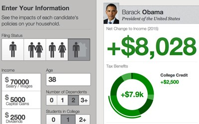 他做的第一个产品 Politify,表面看像个税款计算器,但比当时同类工具更进一步。2012年大选前后,许多竞品只是简单的税款计算器,基于粗略的税率推算个人负担;Politify 则需要家庭状况等细节,模拟不同总统候选人的政策(如奥巴马或罗姆尼的税改、福利调整)会对个人、社区乃至全国财务造成全面冲击,包括收入变动、支出影响和政府服务使用。