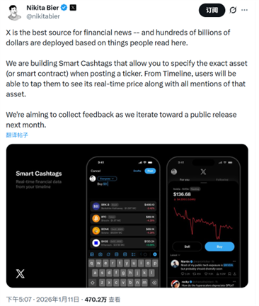 X 正在推动金融功能,如 Smart Cashtags 的实时资产价格显示(包括 crypto),预览版已支持智能合约和资产提及,旨在让 X 成为可靠的金融新闻和交易讨论枢