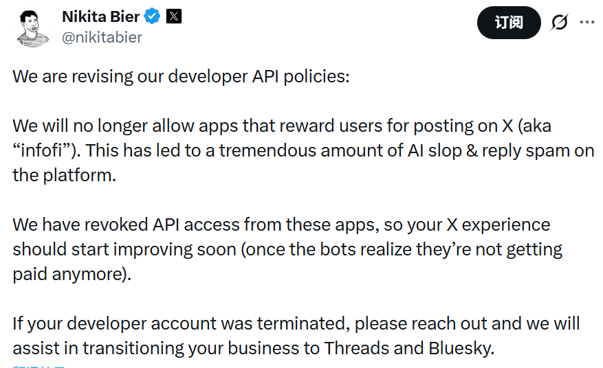 1月16日,Nikita投下一颗重磅炸弹,他宣布X 修订开发者 API 政策,不再允许“infofi”类 app(奖励用户发帖的机制),并直接撤销了这些 app 的 API 访问。