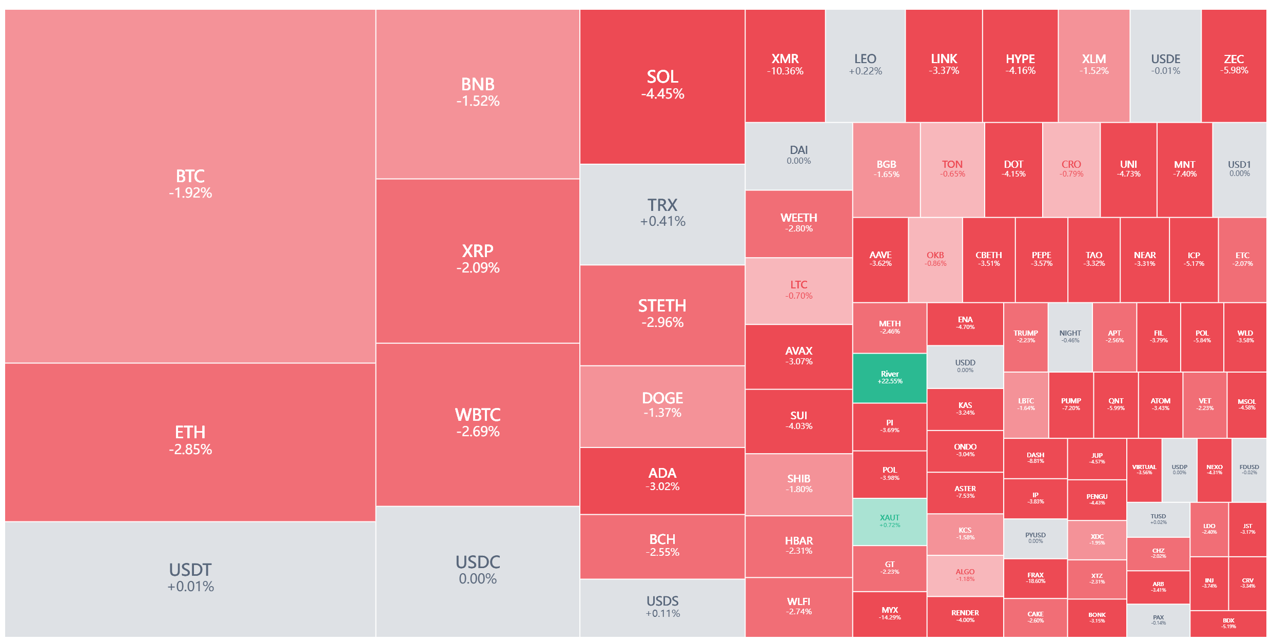 当宏观市场风声鹤唳时,加密货币市场也正经历一场深刻的内部调整。数据显示,在1月19日至23日的一周内,市值排名前100的加密货币中,超过80种出现了下跌,市场总市值缩水近7%,回落至3.02万亿美元的水平。