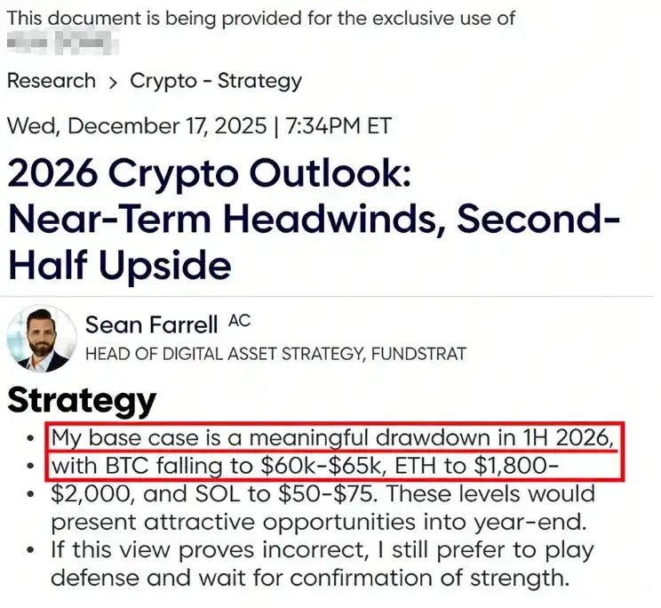 然而,当市场把目光从镜头前移向机构内部文件,画风出现反转:在 Tom Lee 创立的 Fundstrat 最新面向内部订阅客户的 2026 展望策略建议中,给出了相反的观点,其基准预测认为 2026 年上半年加密资产可能出现显著回撤,ETH 目标区间为 1800–2000 美元。这种「公开喊多」与「内部看空」的表述差异,也将 Tom Lee 本人与其关联机构推至舆论的风口浪尖。