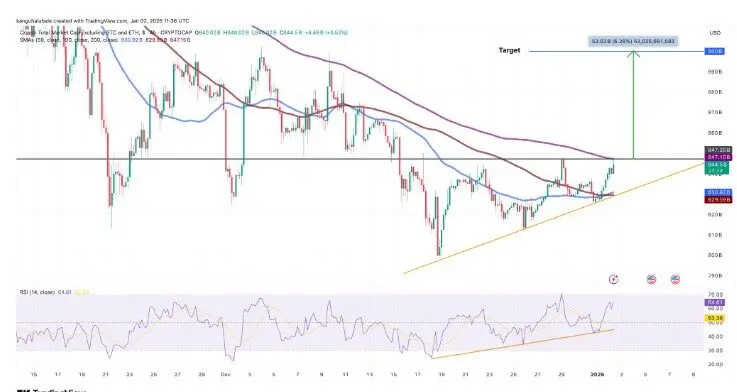 当前 TOTAL3 正测试约 8480 亿美元的关键阻力位,该区域同时对应 200 日均线与中期趋势线。若后续放量突破并站稳,则技术目标可上看 9000 亿美元,为山寨币及 Meme 币的延续反弹提供空间。