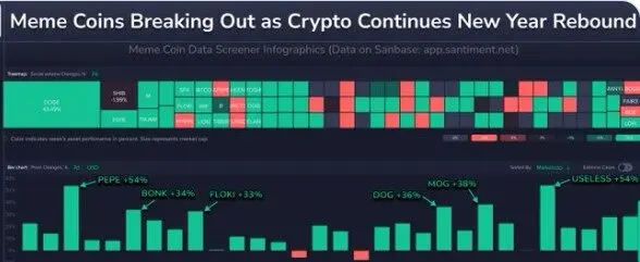 出乎许多人意料的是,新年伊始点燃加密行情的并非比特币或以太坊,而是 Meme 币,在经过一段平静的假期和低迷的市场活动后,Meme 币正在强势回归。
