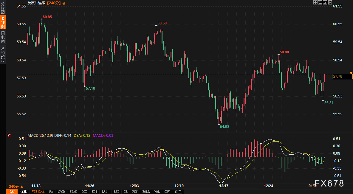 原油市场受地缘事件与需求预期双重影响。WTI原油在创下新低后反弹至57.72美元附近,日内转为上涨。技术上,4小时图显示价格在测试前期低点后反弹,MACD指标有在低位形成金叉的迹象,但上方需关注布林带中轨及60周期均线构成的阻力区域。