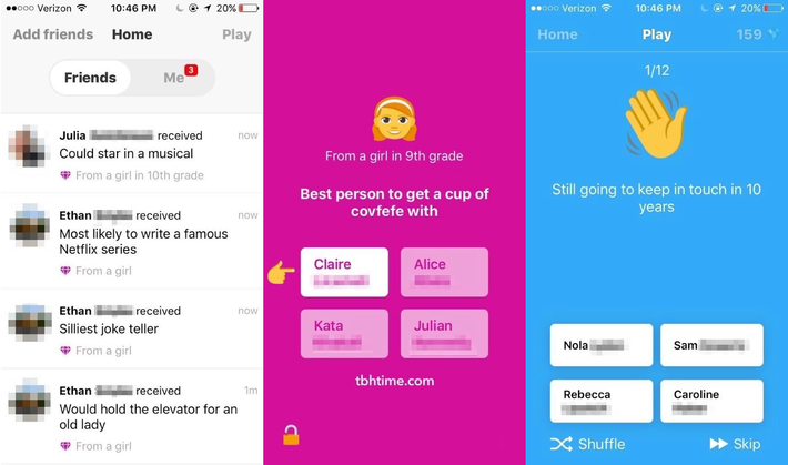 真正让 Nikita Bier 出圈的,是 2017 年的 TBH(To Be Honest)。一款针对高中生的匿名互赞应用,只允许正面反馈,避免有毒社交。细节上,它从一所乔治亚州的高中起步,靠学生群体中的自然裂变,在两个月内达到了500 万总用户,和日活 250 万。而这一切仅仅依靠四个人——Nikita Bier 和三位联合创始人(Erik Hazzard、Kyle Zaragoza、Nicolas Ducdodon)