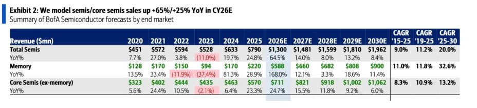 美国银行的策略师们近日公布的一份预测数据显示,在全球最核心AI算力产业链领军者们(英伟达、博通、台积电以及迈威尔科技所主导,前瞻估值在15x-20x之间)以及存储/逻辑芯片、2.5D/3D先进封装、数据中心电力链条等领域加速增长的推动下,到2030年,全球半导体市场总规模将达到2万亿美元,2025至2030年的年复合增长预期为20%。相比之下,至少截至2025年,全球半导体市场规模不到1万亿美元。